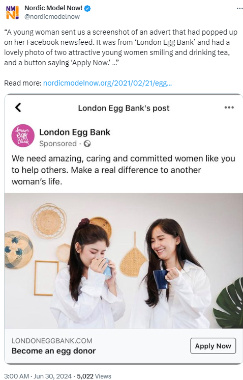 Nordic Model Now!, “a secular, feminist, grassroots women’s group based in the UK that is campaigning for the abolition of prostitution and related practices (such as lap-dancing, pornography and surrogacy),” reports that the London Egg Bank is placing advertisements for… Continue Reading →